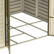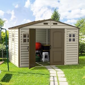 • Duramax WoodSide 10 x 8 (8.02 m2) Plastic Garden Shed with 3 Fixed Windows & Metal Foundation Kit, Strong Metal Roof Structure Fire Retardant and Maintenance-Free Storage Shed - Ivory/Brown
