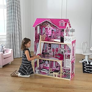 Home / Toys & Games / Wooden Dollhouse with Elevator, Balcony and 15-Piece Accessories, Pink, Gift for Ages 3+