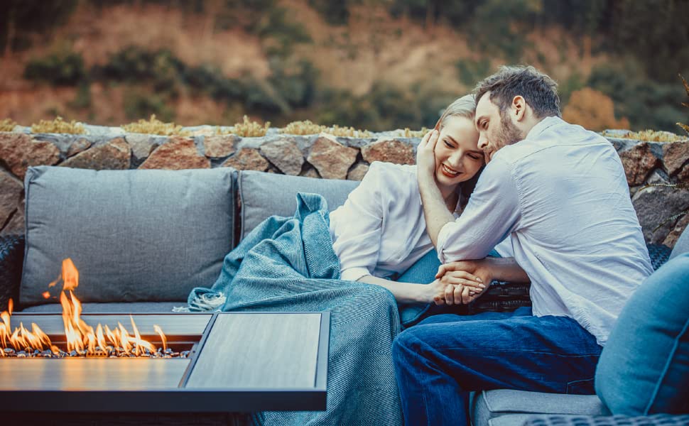 【Fire Pit Table】Complete with a high-efficiency burner, Integrated push-button ignition starts and adjusts flame height easily (AA Battery required), up to 50,000 BTU heat. Suitable for standard 20lb propane tank (not included). Also the table lid allows you to close the surface top, can be used as an outdoor dining table or coffee table.
