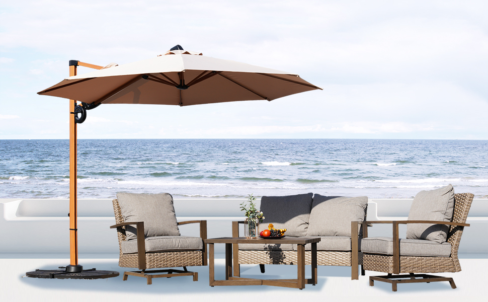 【ULTIMATE COMFORT】Upgraded Grand Patio set has 2 stationary rockers with integrated rocker, which you can slightly shake the chair back and forth in ultimate comfort. A 20% wider seat combined with thick olefin cushions provide enough space for more comfortable, keep your back much more relaxed.