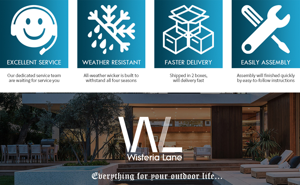 PRODUCT SIZE: Wisteria Lane aluminum outdoor patio furniture set comes with 1 x Three seat sofa, 1 × Loveseat, 2 × Armchair, 1 × Table. Three seat sofa: 73"×26"×32", Loveseat: 50"×26"×32", 2 × Armchair:28"×26"×32", Table: 43"×24"×16". Come and enjoy the outdoors with Wisteria Lane!
