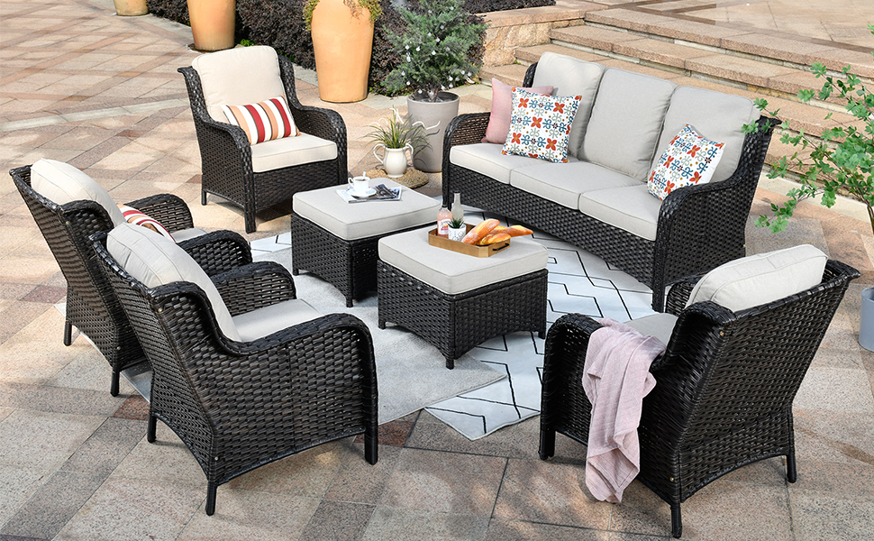 The whole patio conversation set includes a 3-person sofa +4 single chairs +2 ottomans which bring you good experience, let us experience a comfortable life at home. The color matching is closer to nature and the curved design is more in line with the human body.
