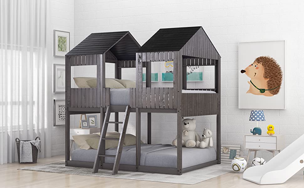 - Featuring a pitched roof and playhouse-inspired wall with window, this bunk bed doubles as a semi-enclosed play place perfect for kids to study, watch TV or explore their imaginations.